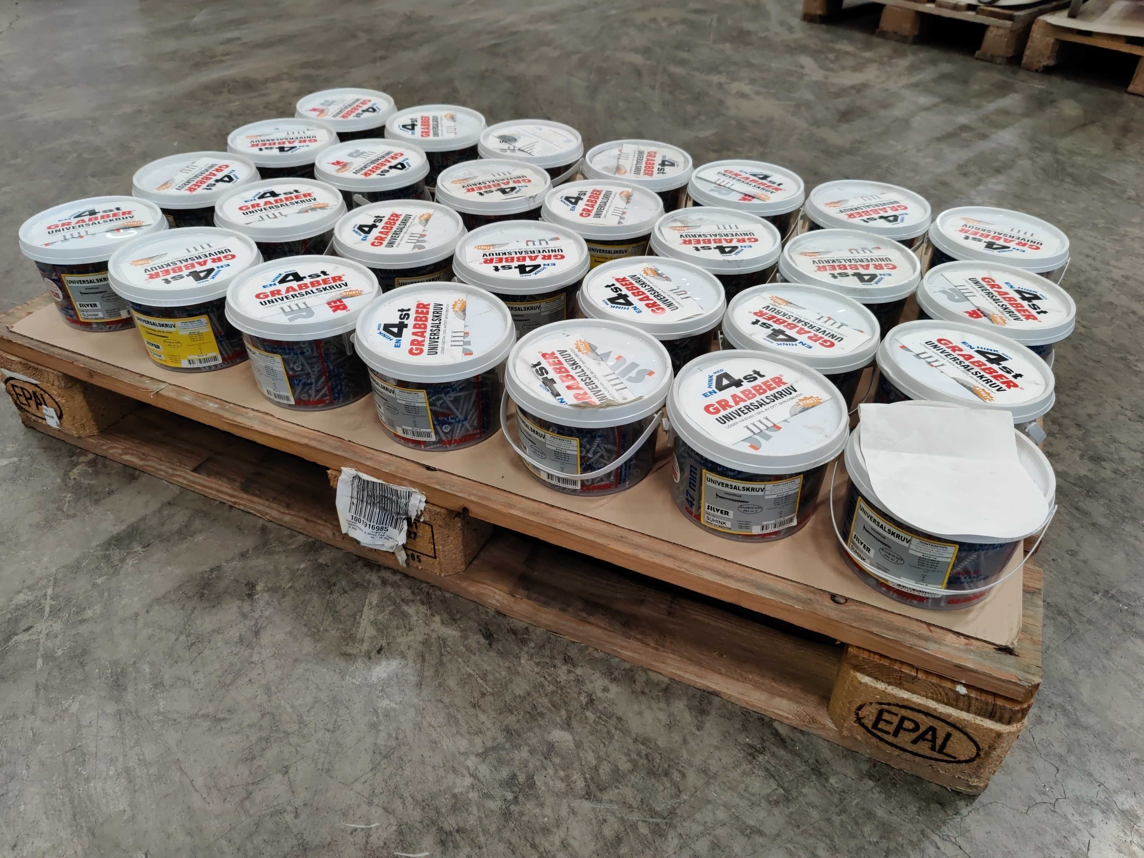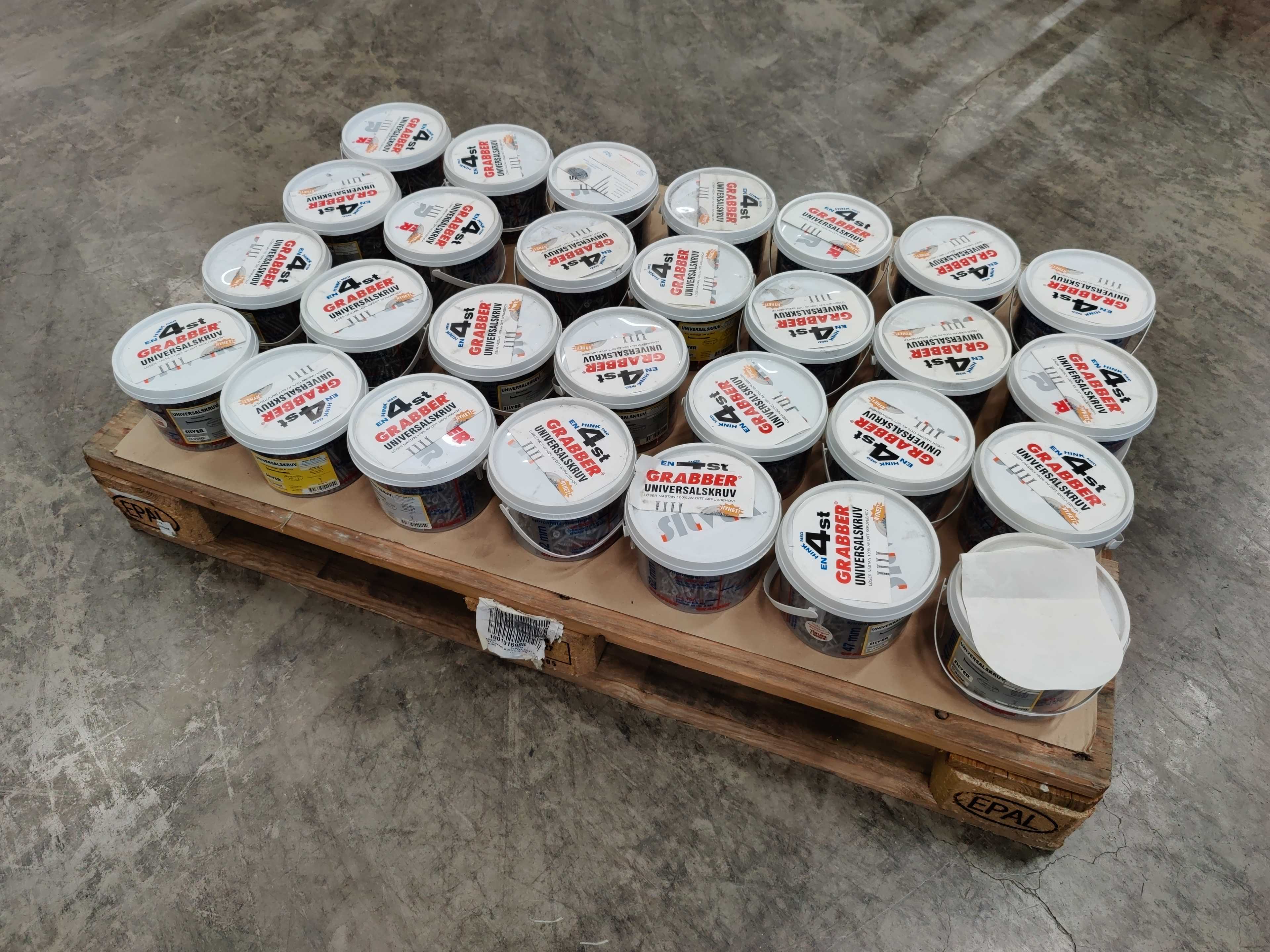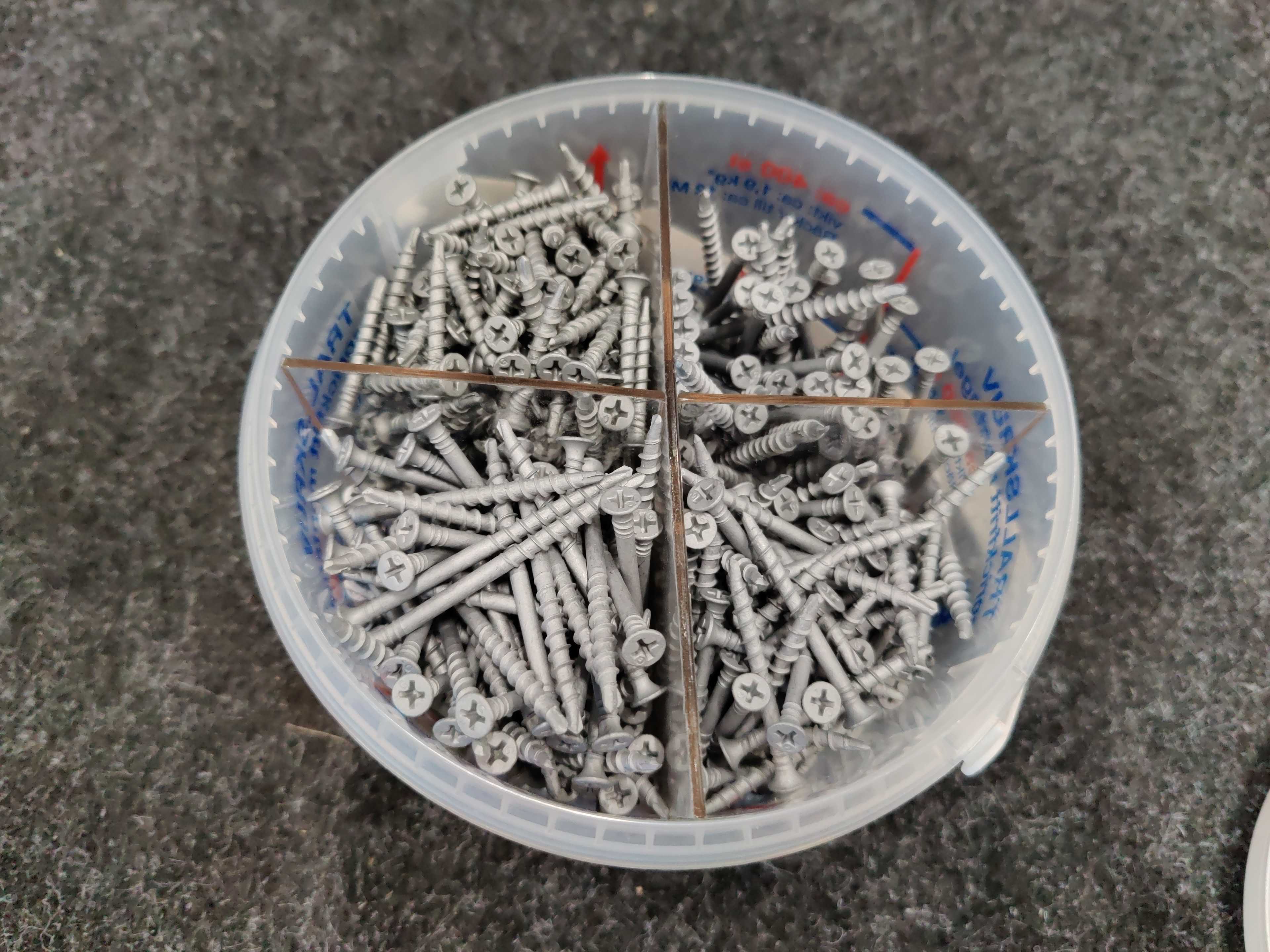 About 28 packs of about 590 screws in each. Four dimensions per pack.
