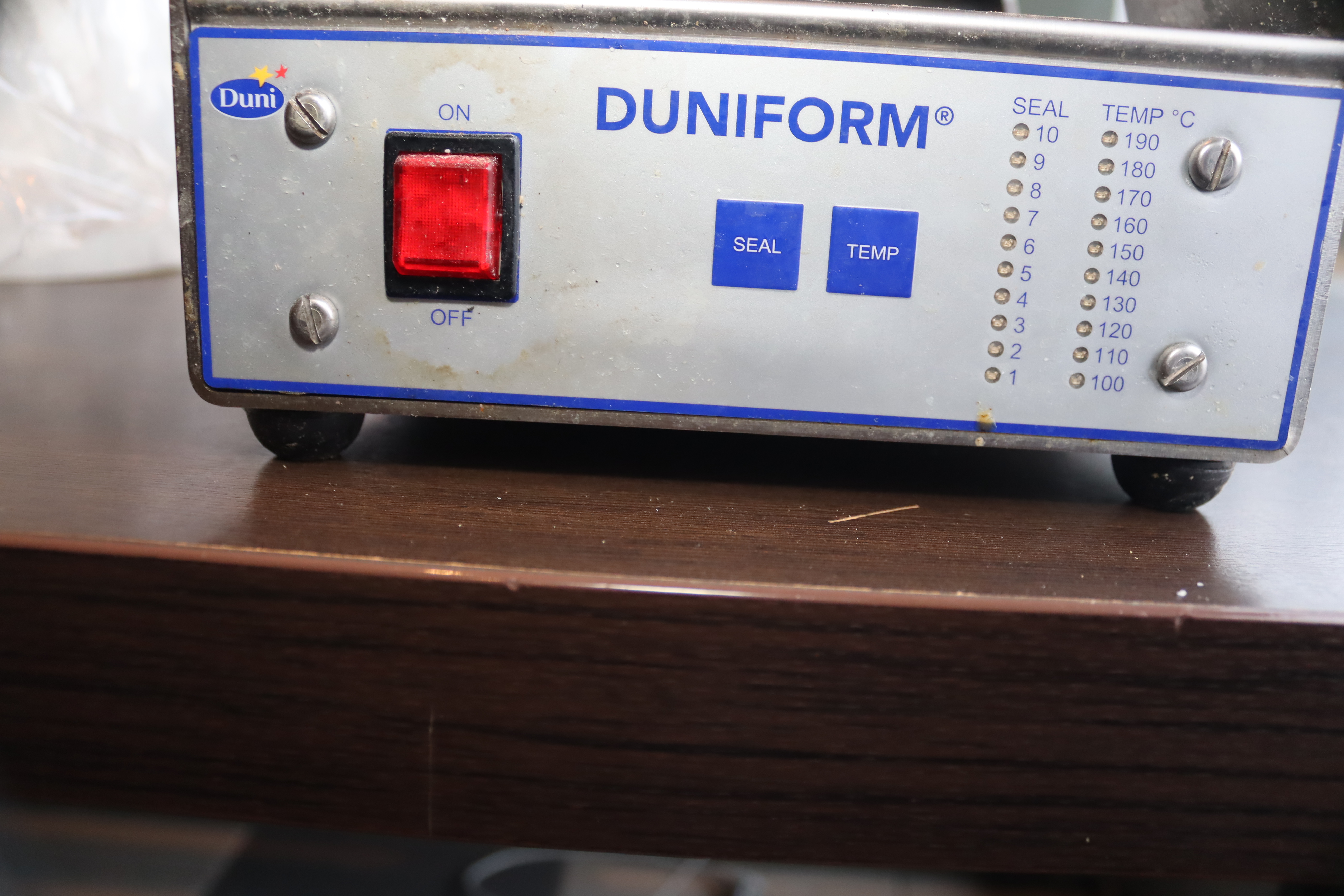 Vacuum sealer for plastic trays, Duniform DF20. 4 rolls of plastic included as shown in pictures.