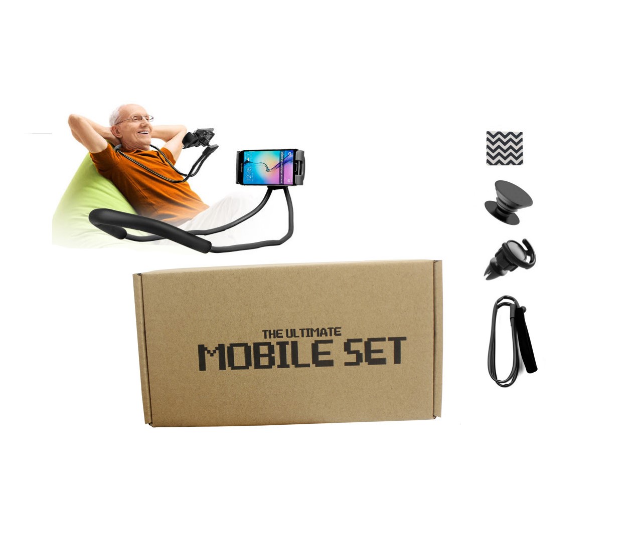 Can be used as the picture shows, around the neck. But the multi holder can also be used in the car to set up your mobile phone.